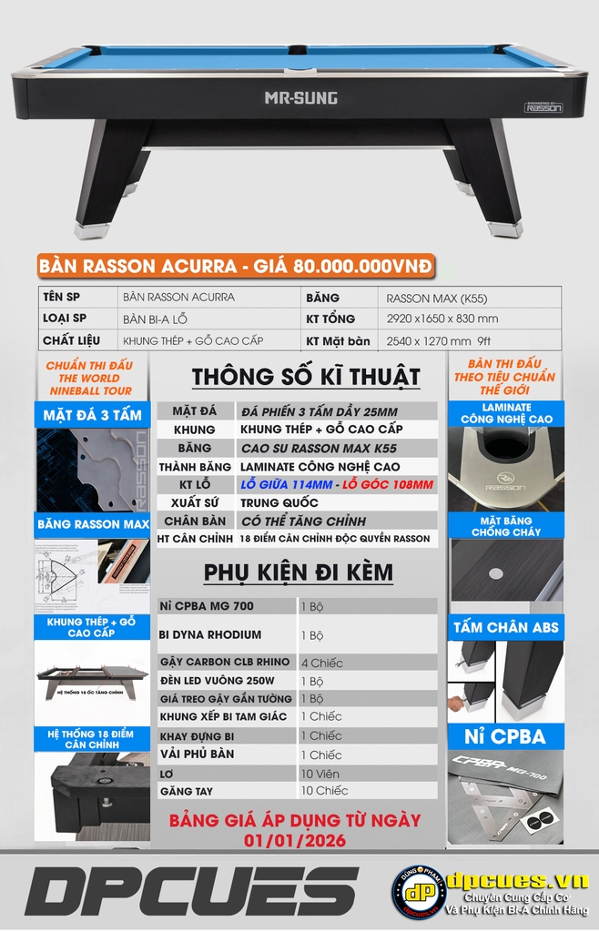 Bàn Rasson Acurra của chúng tôi được trang bị Hệ thống cân bằng đá phiến Hệ thống hộp cân bằng được thiết kế và cấp bằng sáng chế riêng cũng như các lỗ được làm từ nhựa TPR